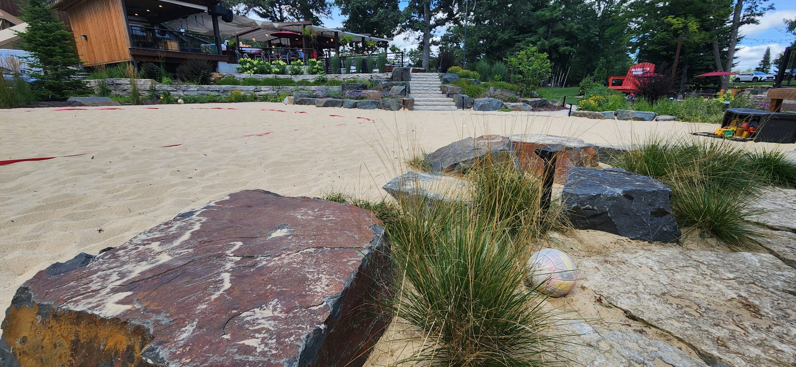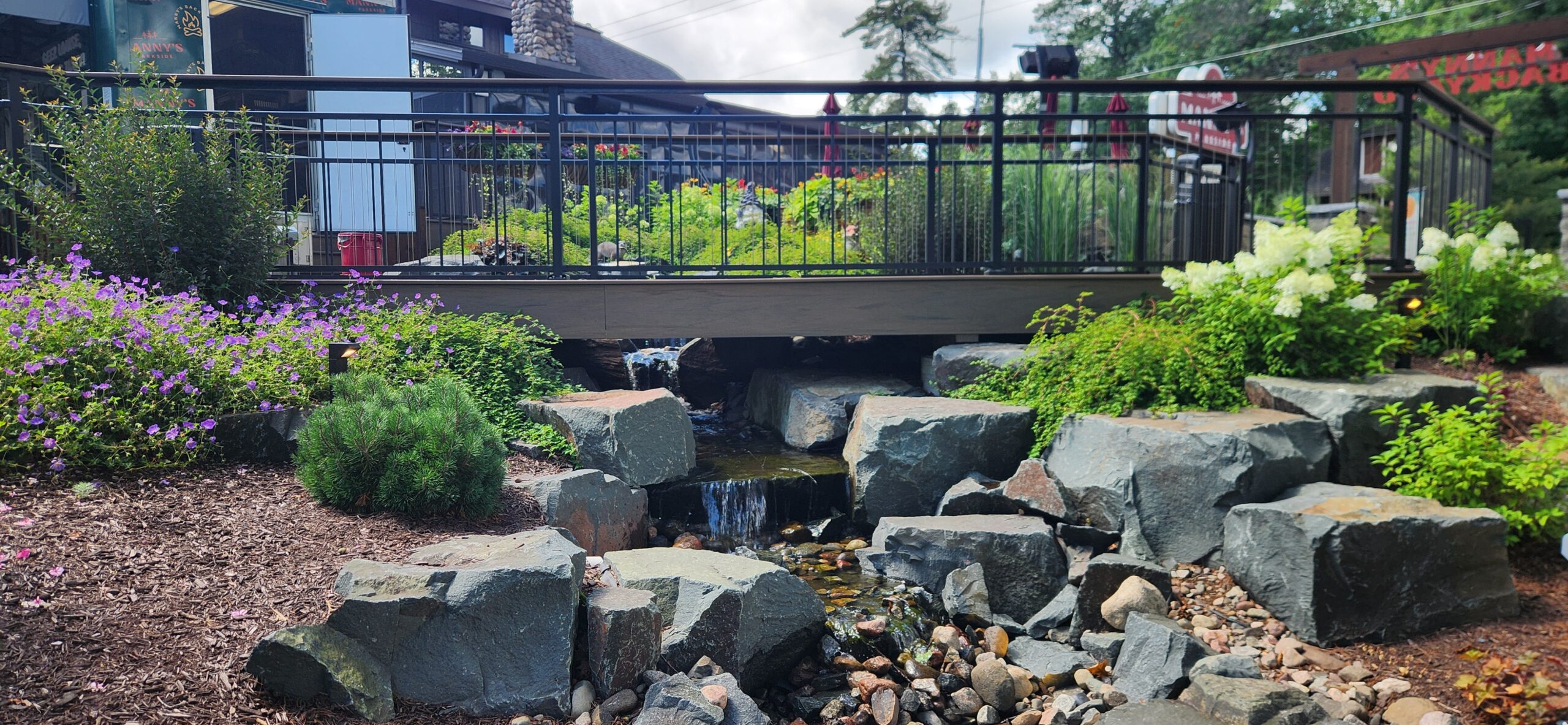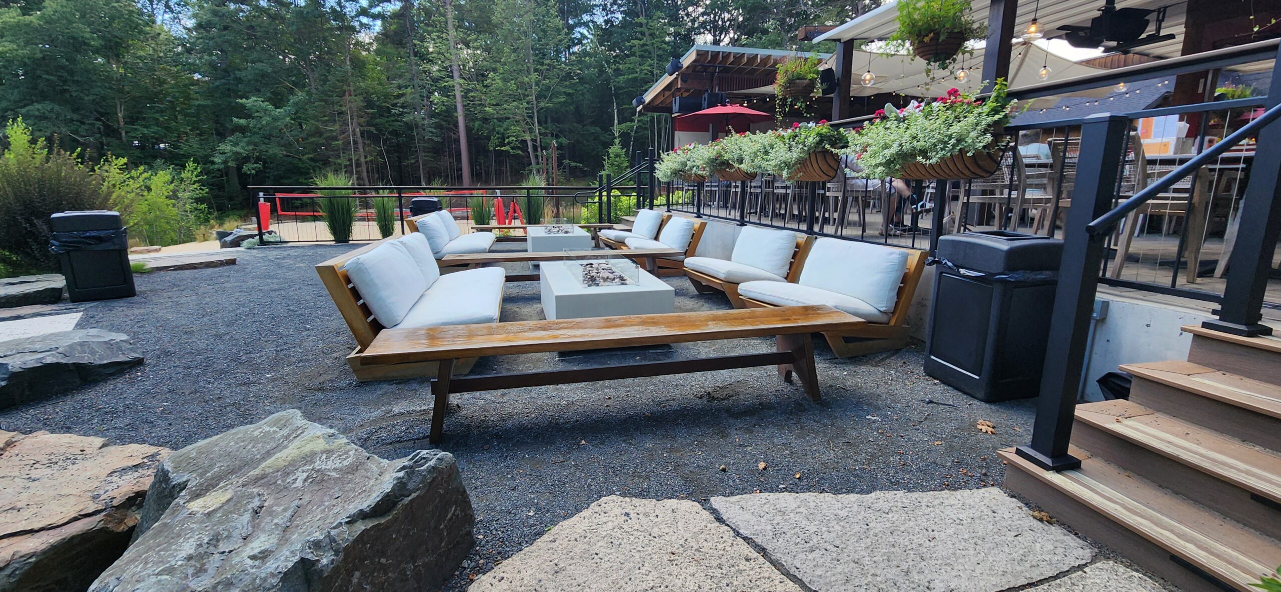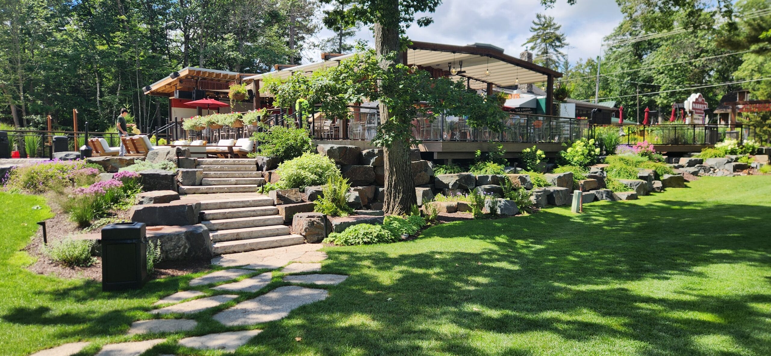 This project involved building an entire patio for a bar/restaurant space which features natural landscaping with gardens and stone pathways leading throughout the grounds. The restaurant patio has a large pergola for shading and tables spread amongst the large patio.