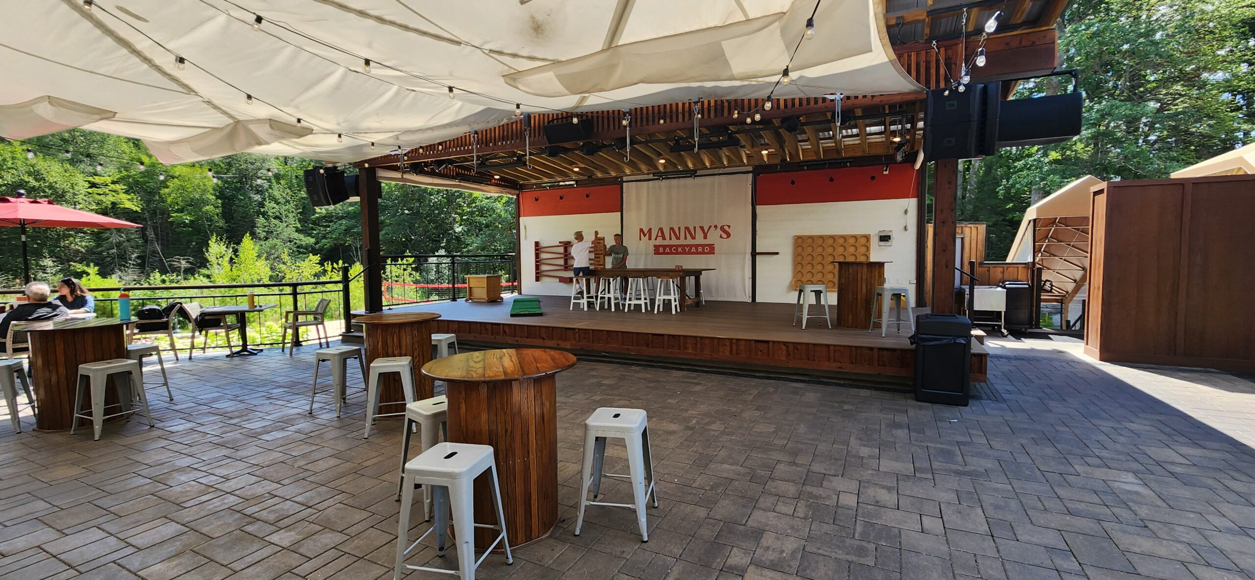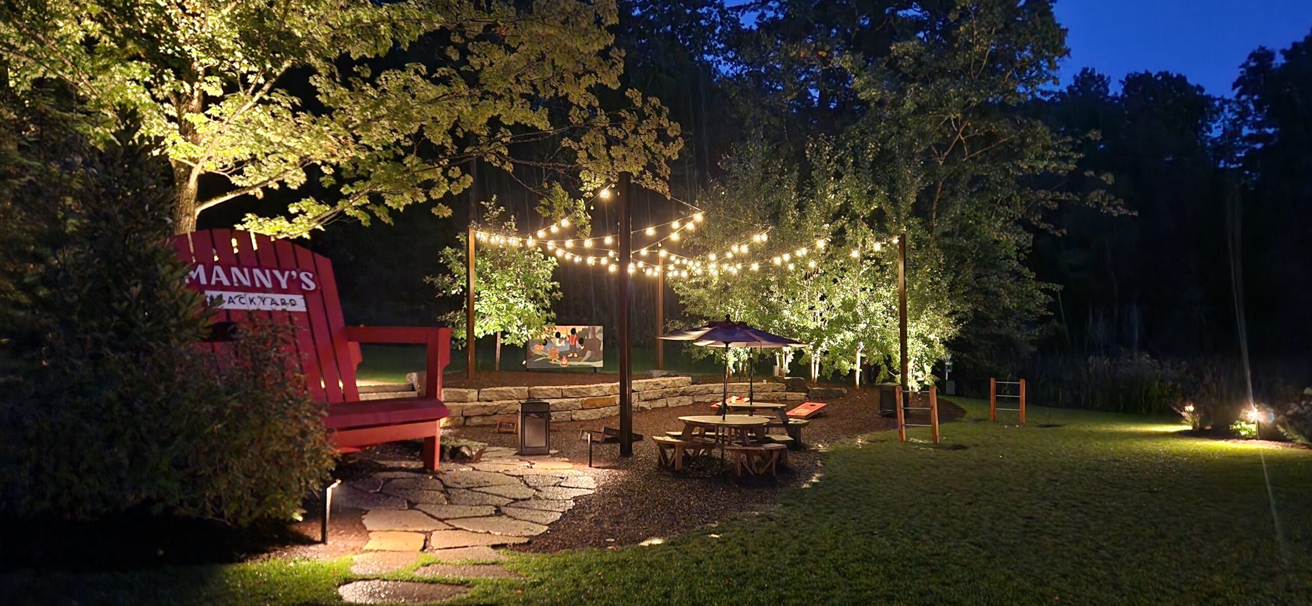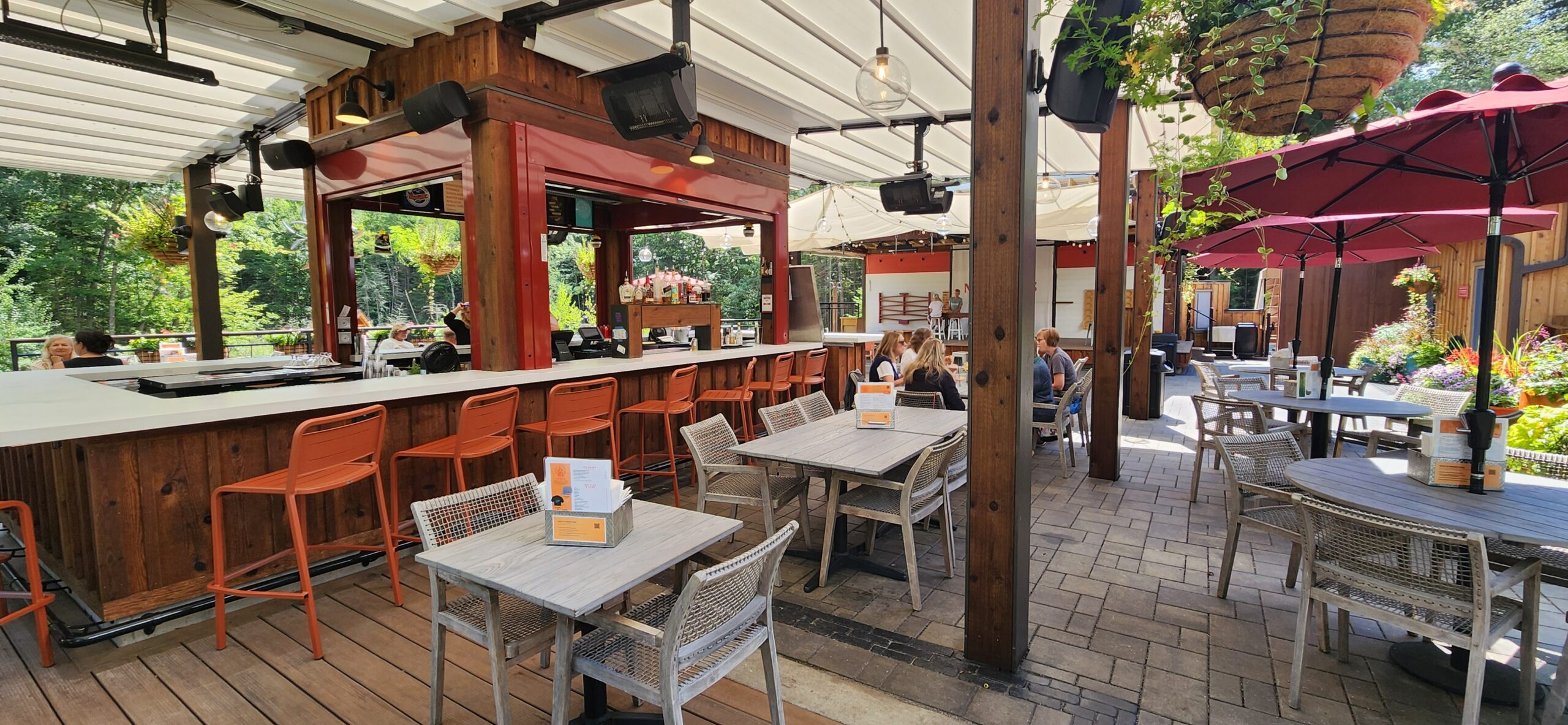 This project involved building an entire patio for a bar/restaurant space which features natural landscaping with gardens and stone pathways leading throughout the grounds. The restaurant patio has a large pergola for shading and tables spread amongst the large patio.