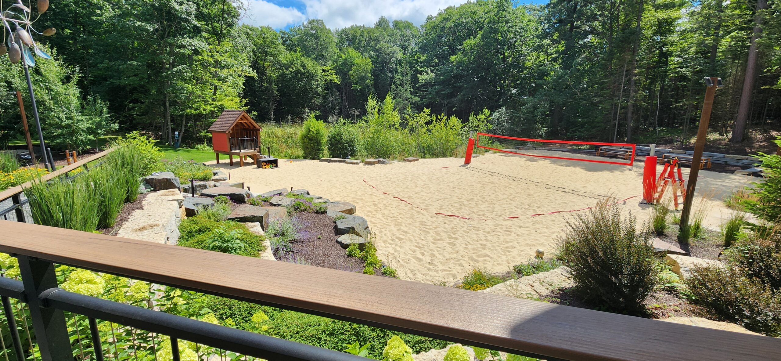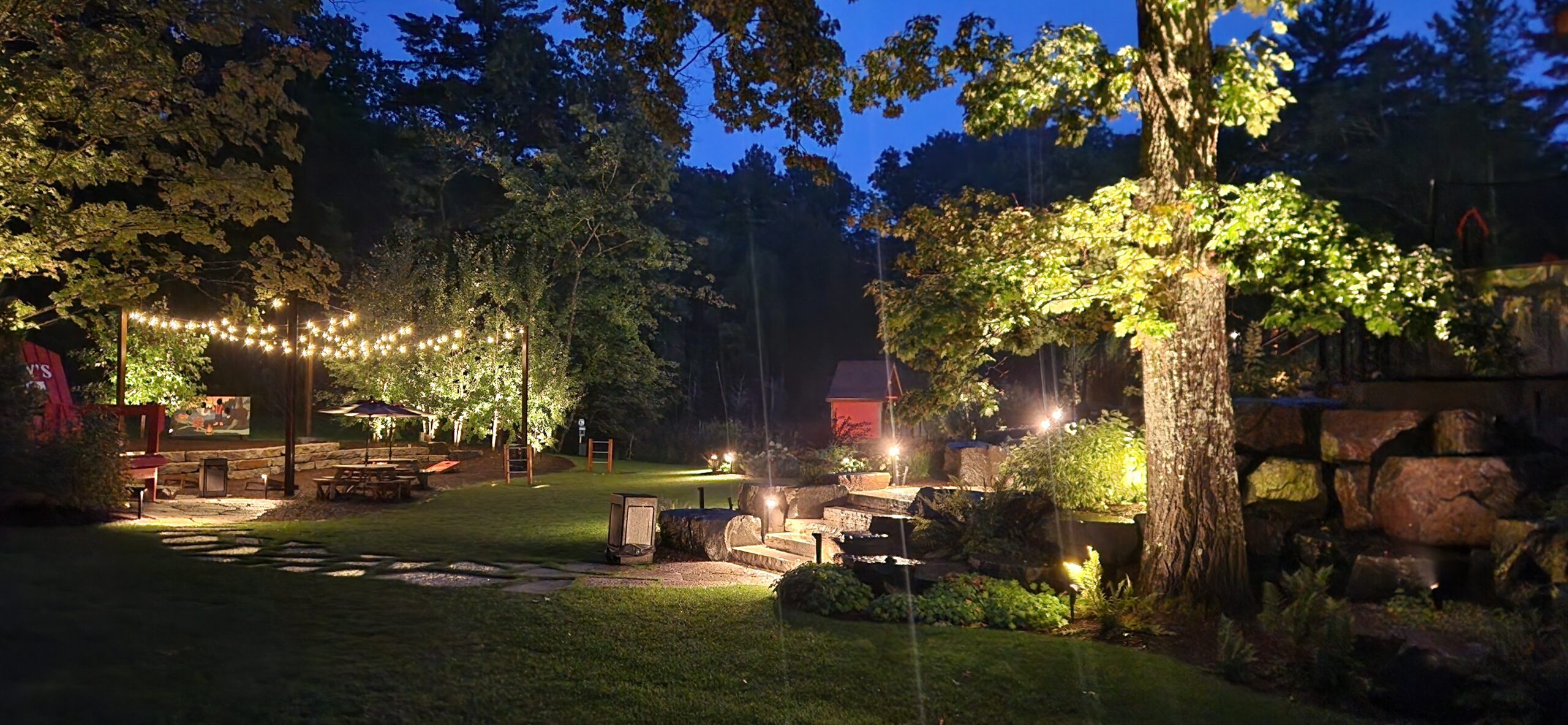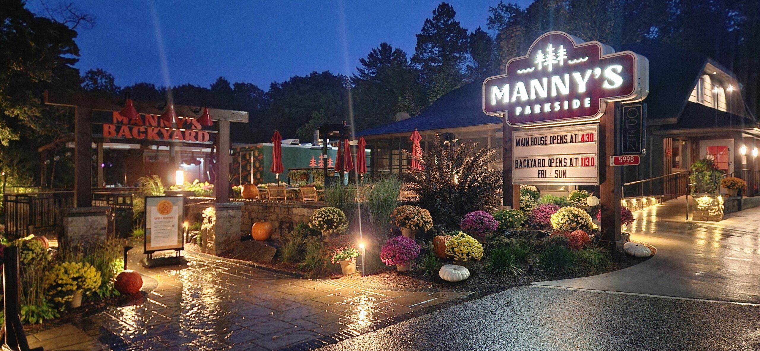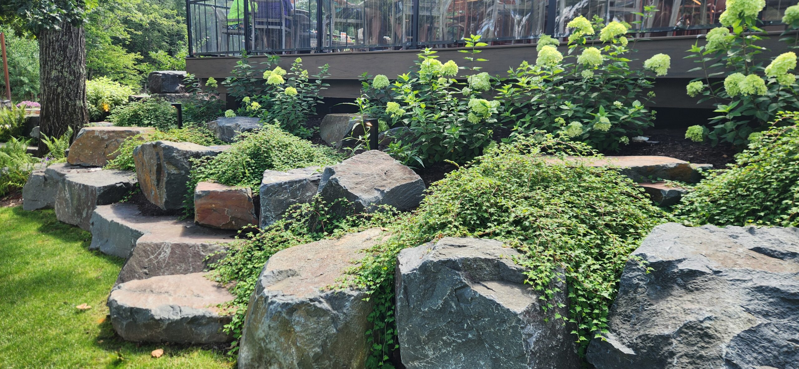 This project involved building an entire patio for a bar/restaurant space which features natural landscaping with gardens and stone pathways leading throughout the grounds. The restaurant patio has a large pergola for shading and tables spread amongst the large patio.