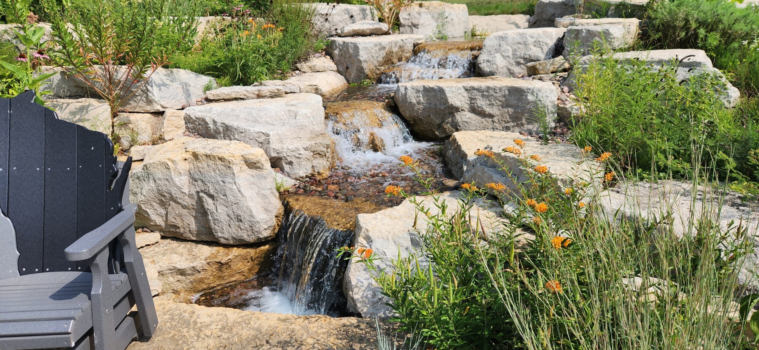 The most striking element of this property is the tiered waterfall system that flows down into the pond. This was achieved using land grading to create the levels for each water flow and as well as using natural stone that fits in with the surrounding area to give it an appearance as if it were naturally occurring.