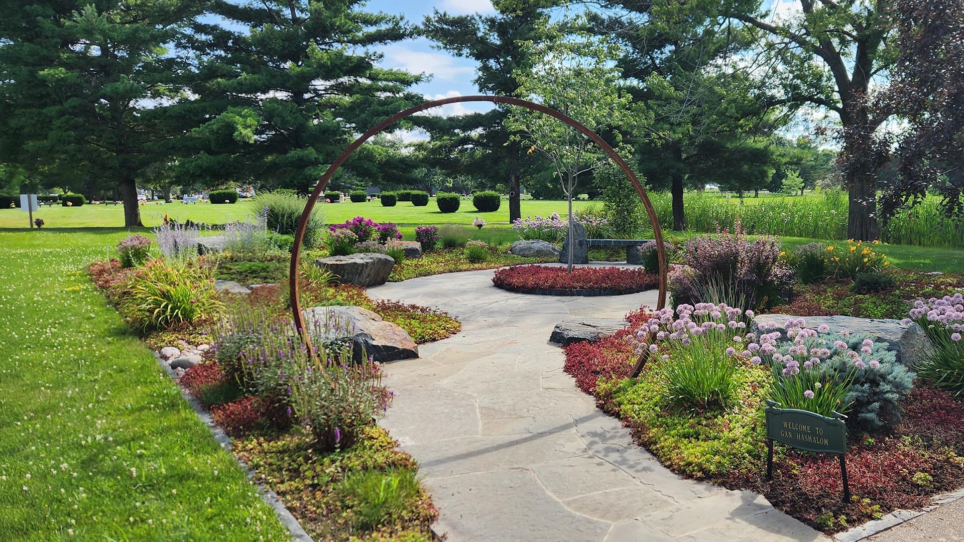 The metal ring standing in the entryway to this patio frames the gardens and creates a sense of space. Featured in this patio are natural stone benches and seating as well as various flower gardens with trees throughout.